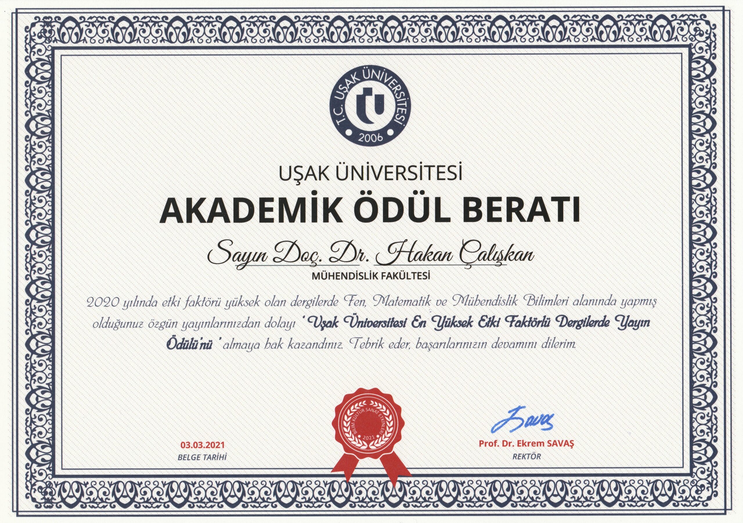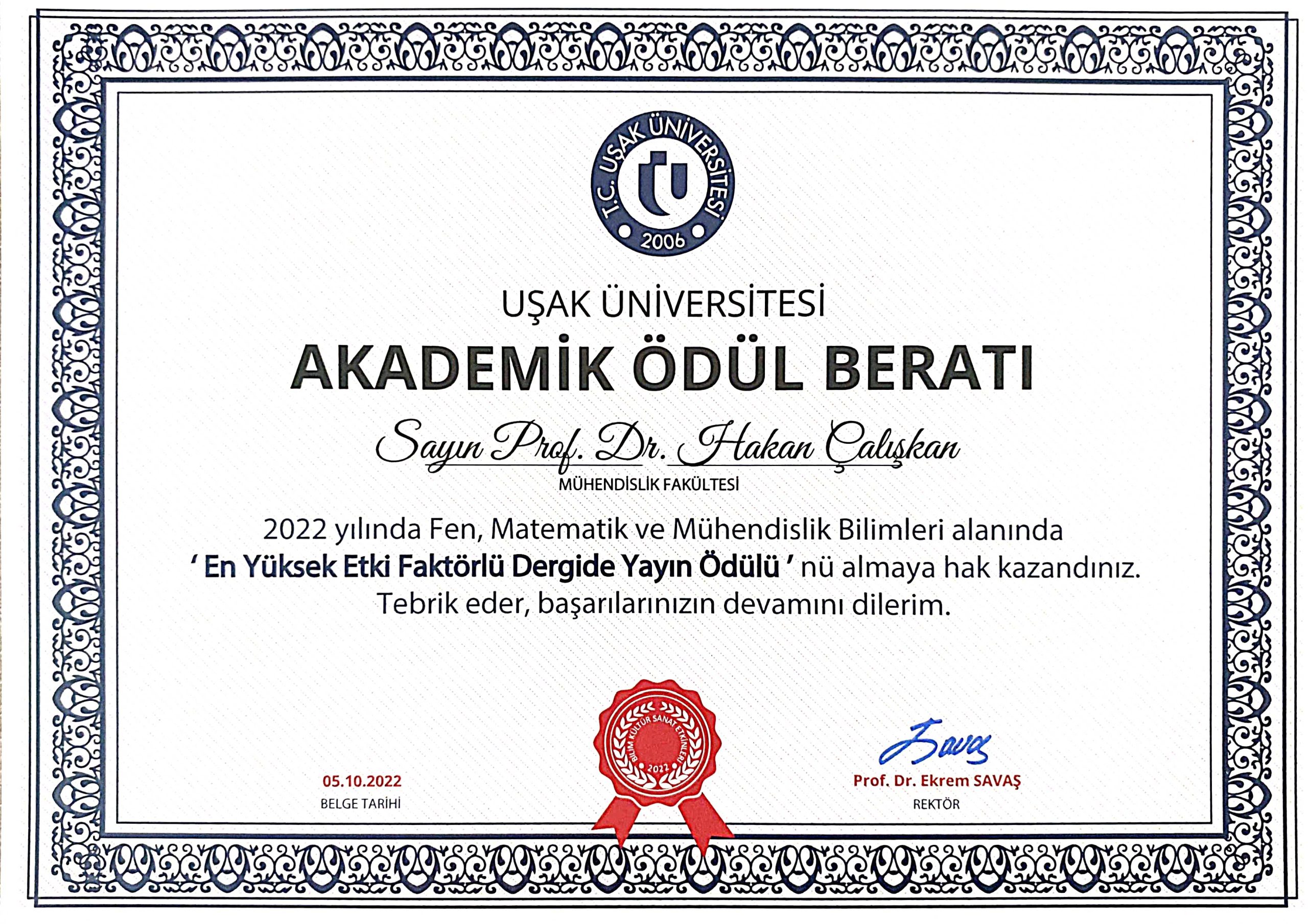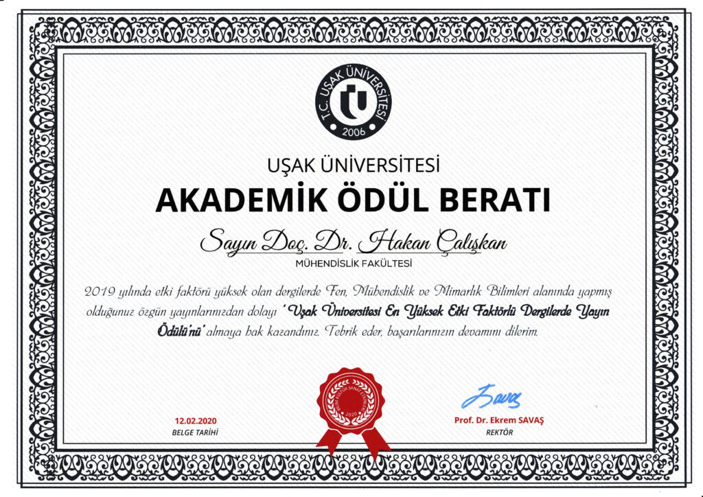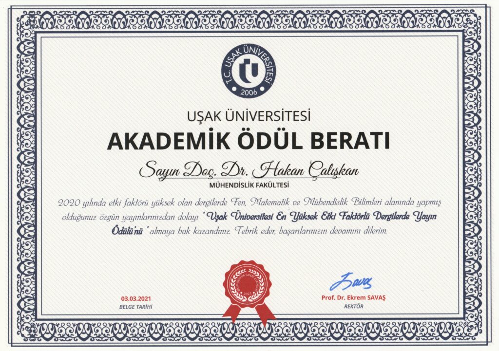 Uşak Üniversitesi En Yüksek Etki Faktörlü Dergide Yayın Ödülü