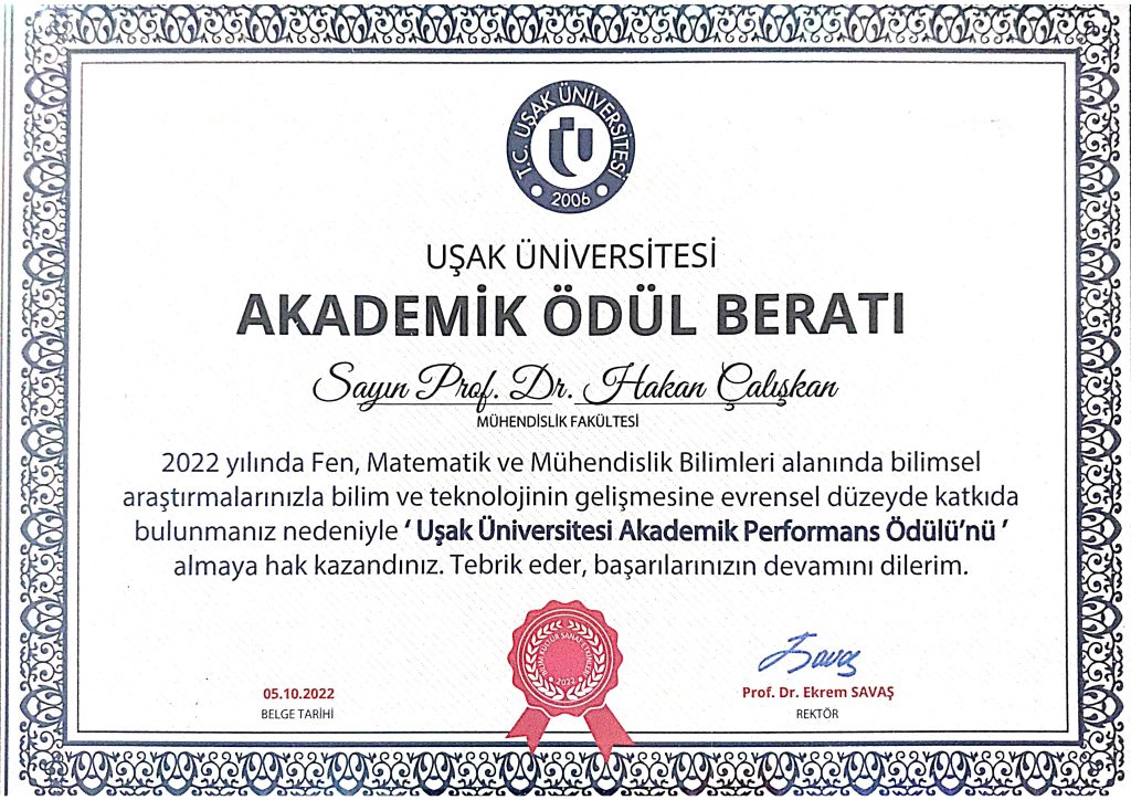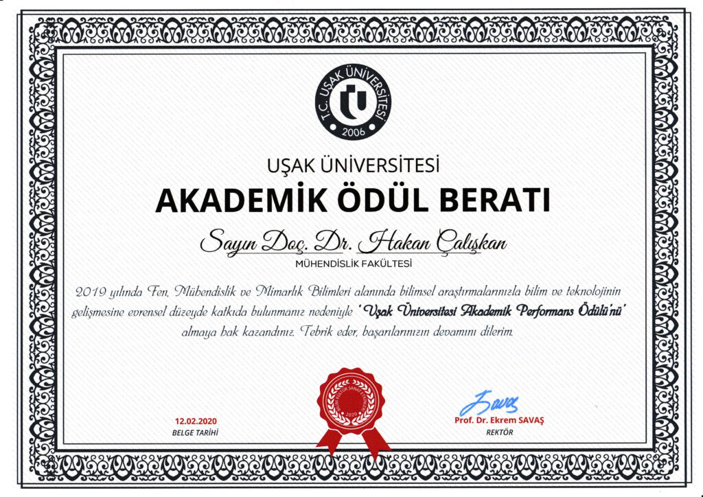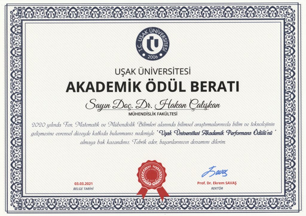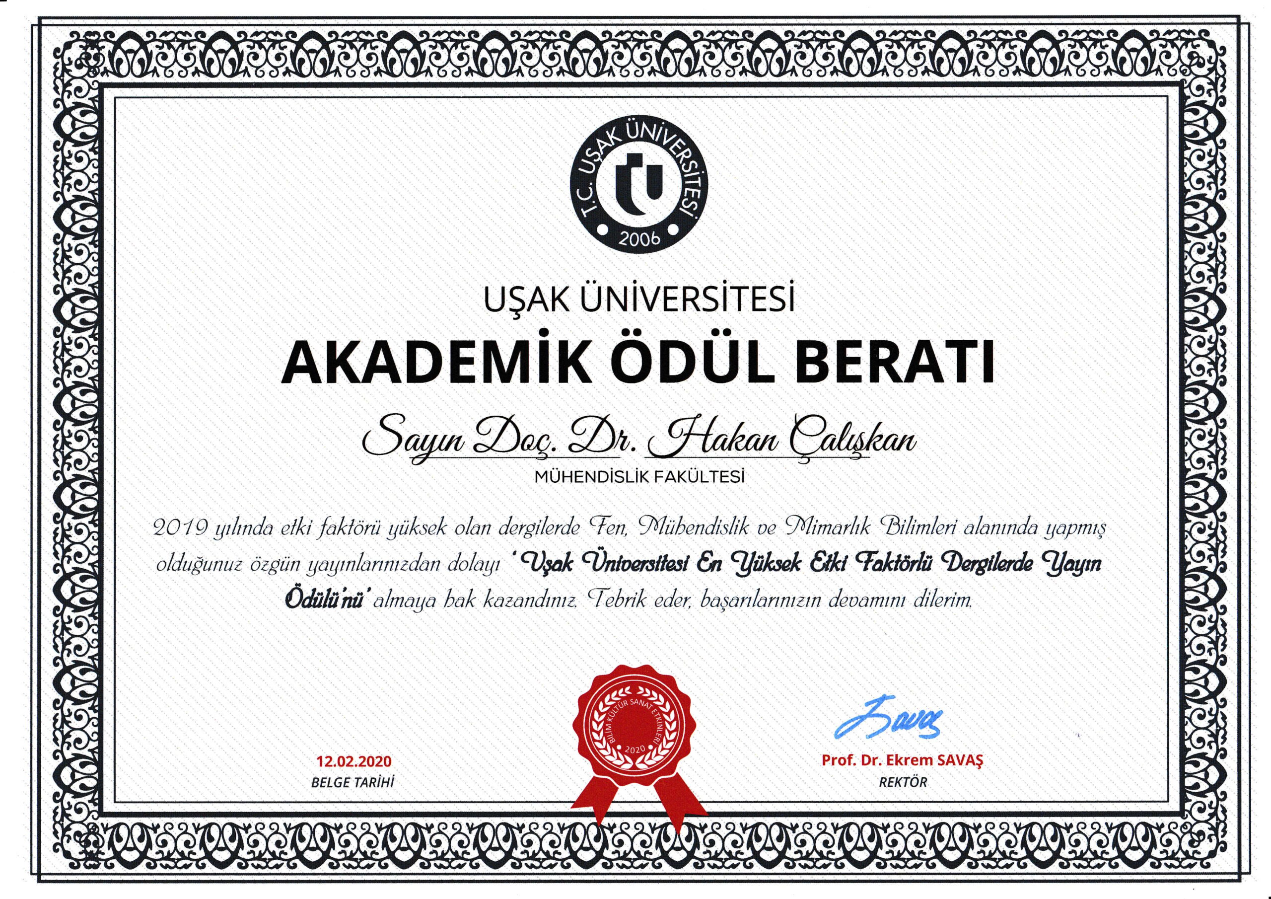 Uşak Üniversitesi En Yüksek Etki Faktörlü Dergide Yayın Ödülü
