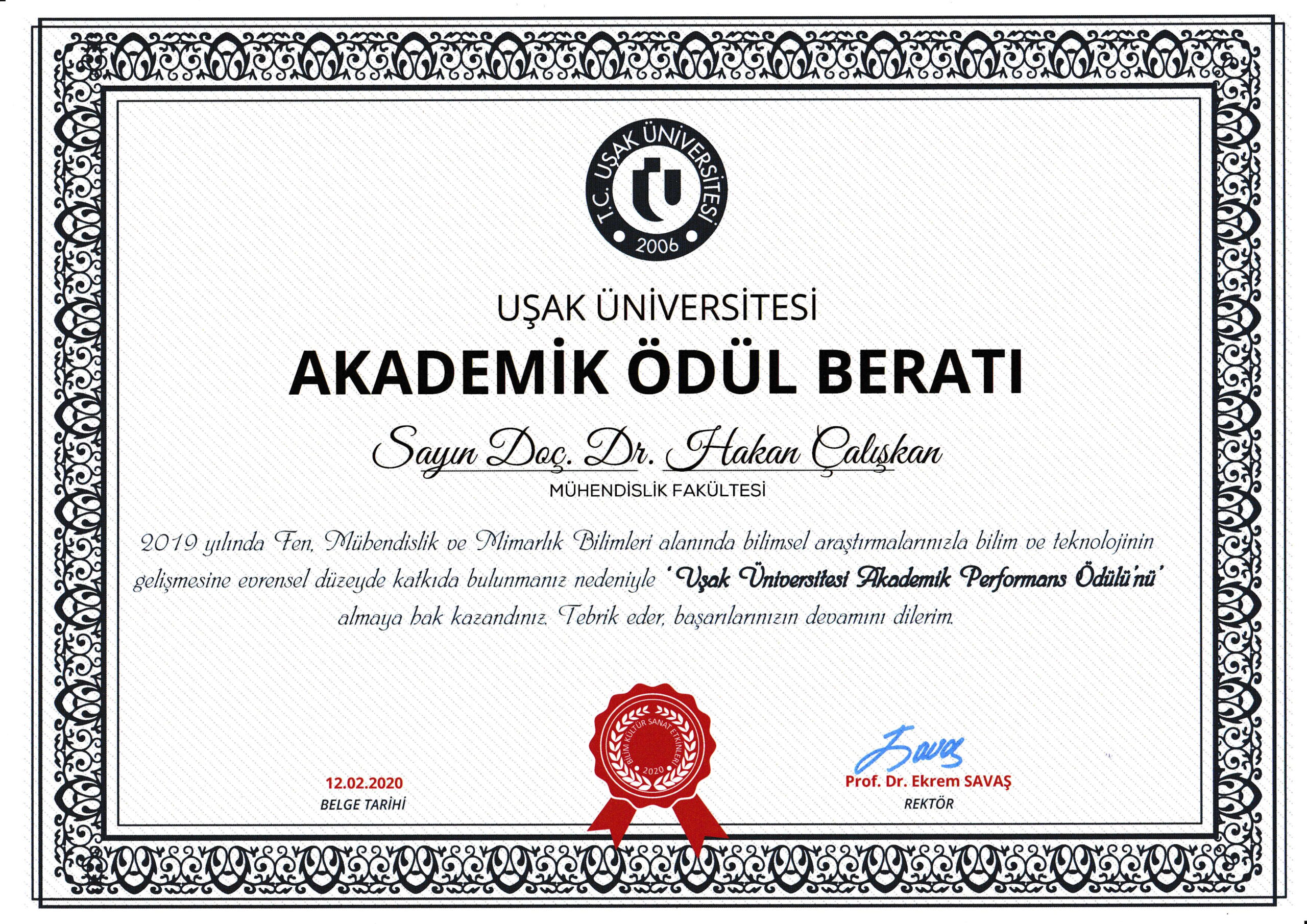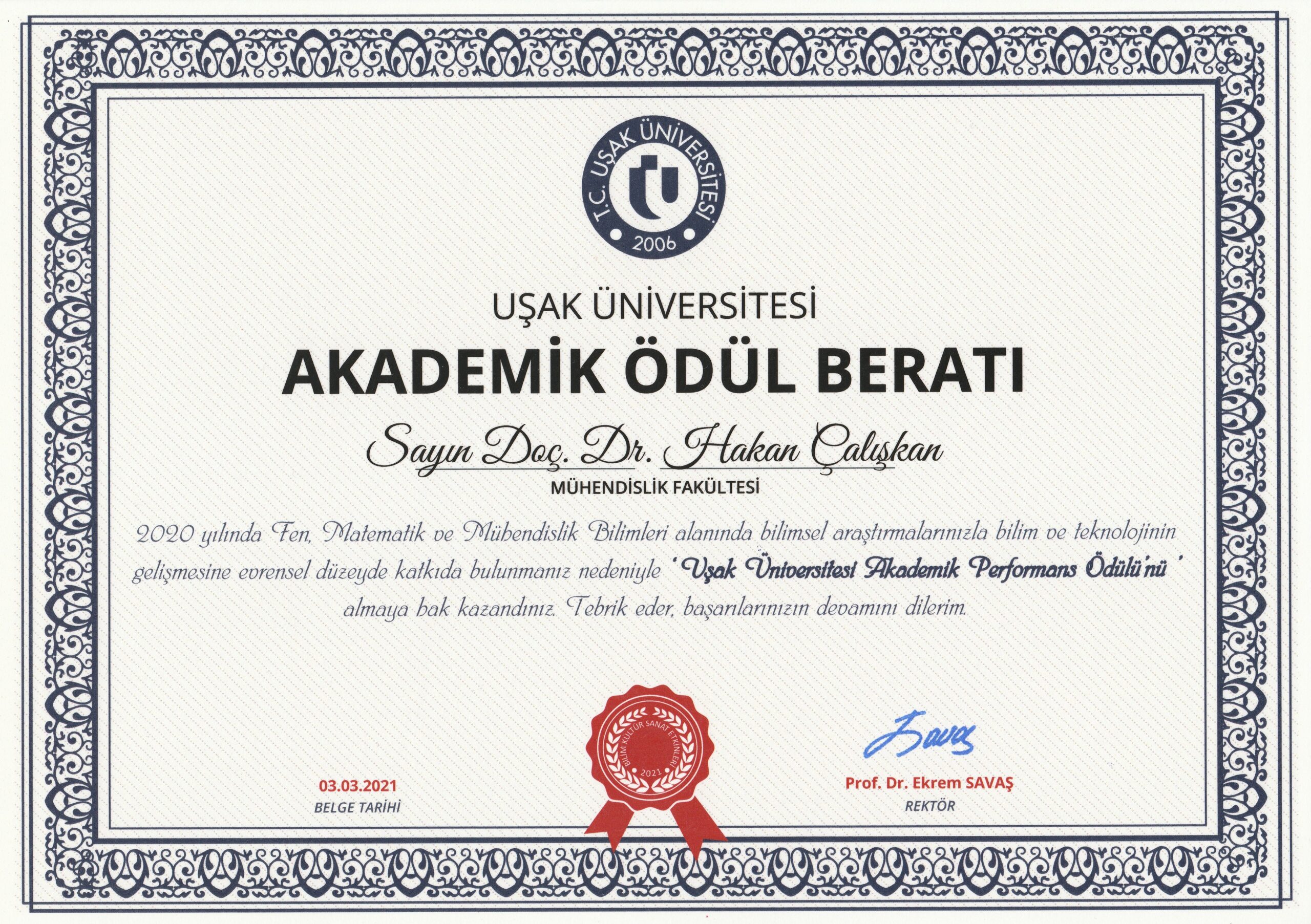 Uşak Üniversitesi Akademik Performans Ödülü